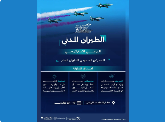 تُشارك الهيئة العامة للطيران المدني راعيًا إستراتيجيًا في النسخة السادسة من المعرض السعودي للطيران العام “ساند آند فن”، الذي ينظمه نادي الطيران السعودي، خلال الفترة من 19 إلى 23 نوفمبر الجاري، وذلك بمطار الثمامة في محمية الملك خالد الملكية بالرياض.
