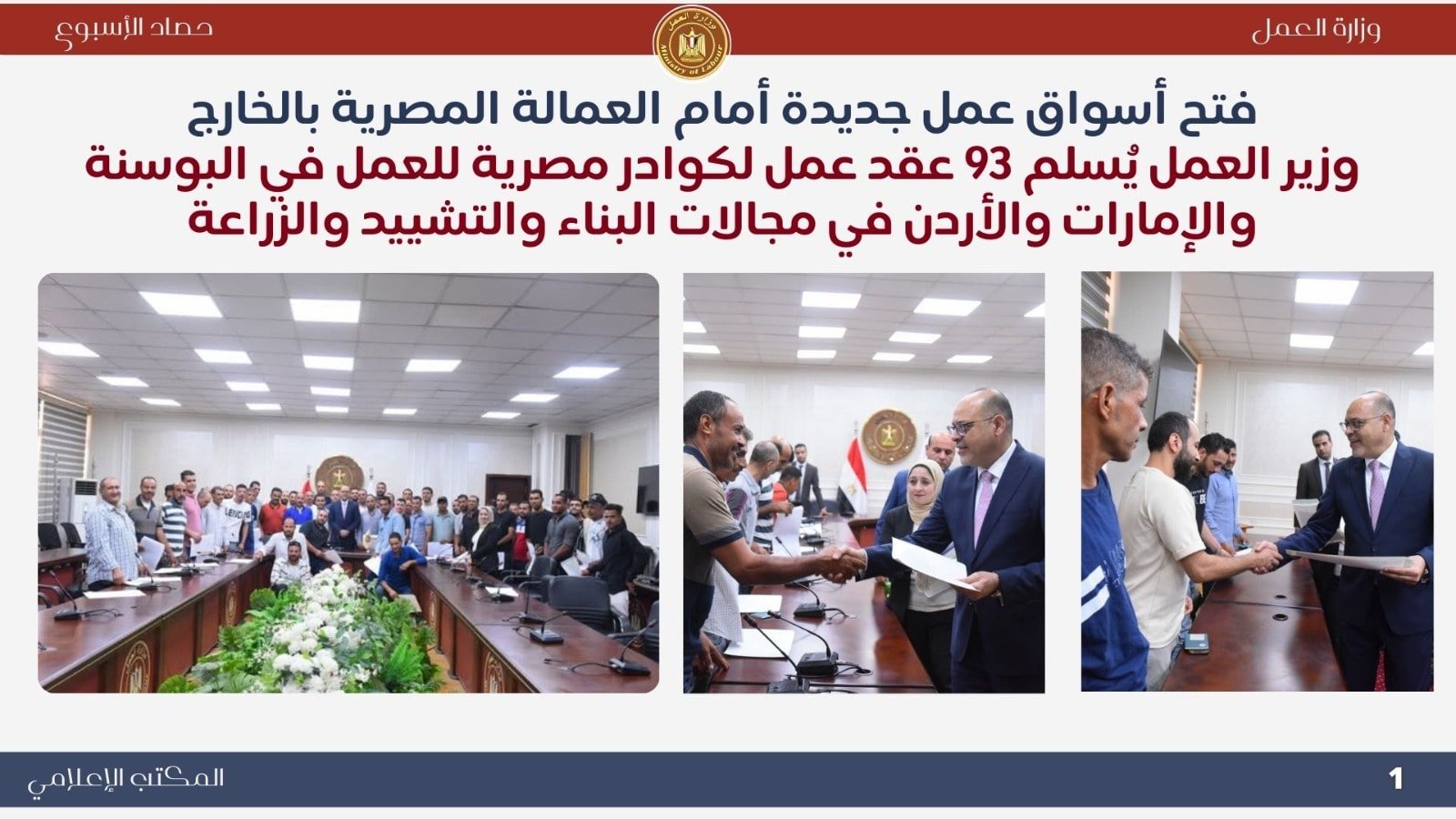 في إطار جهودها لفتح أسواق عمل جديدة أمام العمالة المصرية، سلّم الوزير 93 عقد عمل للكوادر التي اجتازت الاختبارات للعمل في البوسنة والهرسك، والإمارات، والأردن. وتنوعت المهن لتشمل مجالات البناء والتشييد والزراعة.