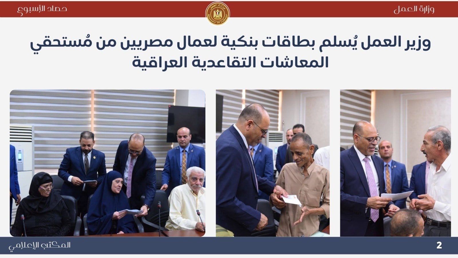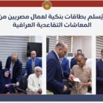 كما قامت الوزارة بتسليم البطاقات البنكية الخاصة بمستحقات المعاشات التقاعدية للعمال المصريين في العراق، وذلك بالتنسيق مع وزارة العمل العراقية. يأتي هذا الإجراء في إطار رعاية وحماية العمالة المصرية بالخارج.